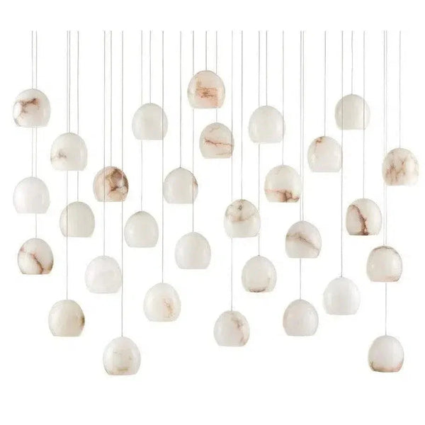 The Lazio 30-Light Multi-Drop Pendant has luminous shades carved from natural alabaster. The veining in the material makes each shade unique because each stone taken from the earth will have its own personality. The canopy of this piece is luminous in a painted silver finish. This fixture is among Currey & Company's multi-drop pendant collection, which includes multiple configurations.