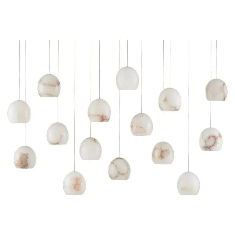 The Lazio Rectangular 15-Light Multi-Drop Pendant has luminous shades carved from natural alabaster. The veining in the material makes each shade unique because each stone taken from the earth will have its own personality. The canopy of this piece is luminous in a painted silver finish. This fixture is among Currey & Company's multi-drop pendant collection, which includes multiple configurations.
