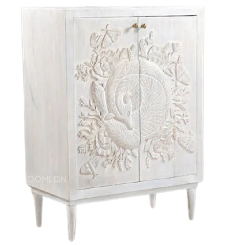 Create an ambiance of a lush forest within your home with our Nayven Mother Nature Tall Cabinet. Its construction of solid mango wood and intricate hand-carved design of a sleeping fox embody natural beauty and sophistication. This unique accent cabinet boasts fixed shelves and a hand-applied whitewash finish, elevating it to the level of a masterfully crafted family heirloom. Easily bring the beauty of nature indoors with this distinctly detailed sideboard cabinet, showcasing a stunningly hand-carved fox in its botanical surroundings. Made of solid mango wood and carefully finished with a tinted whitewash, this buffet exudes a luxurious aesthetic.