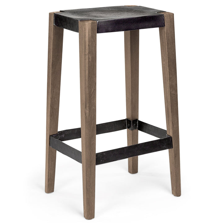 Featuring a unique blend of materials, this bar stool offers a stylish addition to any home. The seat is made from strong metal, ensuring long-lasting durability. Its solid wood base not only provides a sturdy foundation but also adds a touch of natural beauty. The wooden legs are joined by a flat, iron cross-brace, enhancing both stability and strength. This design makes the stool an ideal choice for spaces inspired by Farmhouse or Industrial styles.