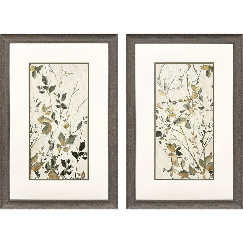 Bring a touch of nature into your home with this beautiful set of two framed botanical art pieces. Each piece showcases garden leaves twisting gracefully in the wind, creating a sense of movement and vitality. The artwork is elegantly double-matted in white and moss, enhancing the natural tones and subtle details of the leaves. With its rustic wood-grain finish moulding, this set adds a charming and timeless element to any room.