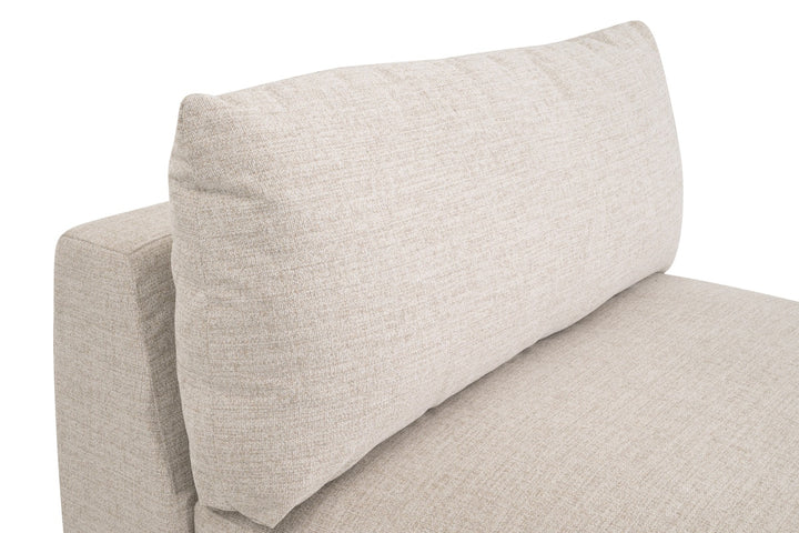 The Newport Outdoor Modular 1-Seat Armless Chair offers a blend of style and durability, perfect for outdoor spaces. Its wide seat and comfortable height make it inviting for relaxation. The chair is designed with marine-grade plywood and solid Accoya wood, providing strength and natural warmth. The removable cushions are upholstered in LiveSmart Shapiro-Sand fabric, which resists moisture and fading, ensuring long-lasting appeal. Filled with air fiber polymer and Dacron wrap, the cushions retain their shape and softness. The modular design allows for flexible arrangements, making it easy to adapt to different outdoor settings. Store cushions during extreme weather to maintain their quality.