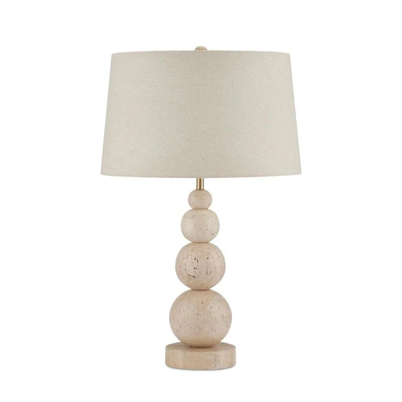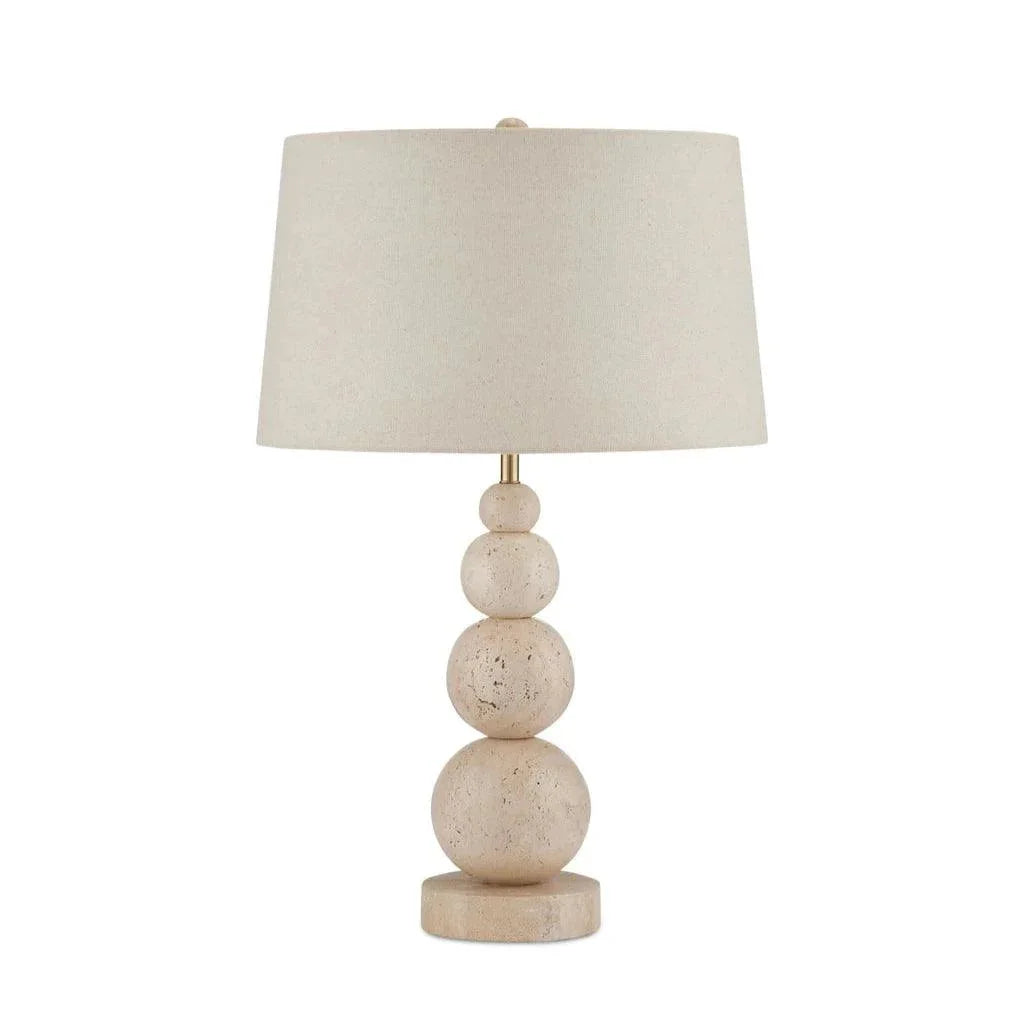 Made of natural travertine, the Niobe Table Lamp has a whimsical profile created by the graduating stacked balls that rise from a disc base of the same material. The texture of the beige lamp is enhanced by the flecks in the flax linen shade. Because this beige lamp is made of natural stone, texture and color may vary from lamp to lamp. Transform your space with a stunning combination of earthy tones and playful design. Each lamp is a unique statement piece, crafted from natural travertine with a textured finish and flecked flax linen shade.