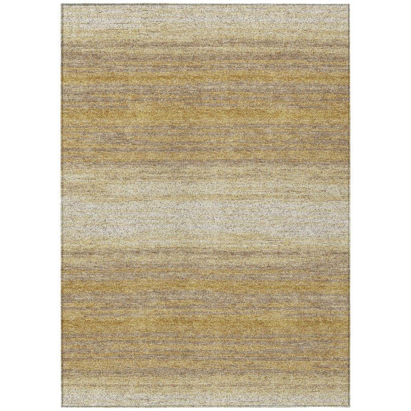 Transform your living space with the Nira Gold Washable Indoor-Outdoor Rug, a perfect blend of style and practicality. This rug features elegant stripes in an ombre effect, arranged horizontally to create a soothing transition of hues. Its transitional design bridges modern and classic styles, making it a versatile addition to any home. Crafted from polyester, this rug is UV stabilized to resist fading, ensuring it retains its vibrant gold color even when used outdoors. Its ultra-thin profile allows for easy placement and quick drying, making it ideal for busy households with kids and pets.