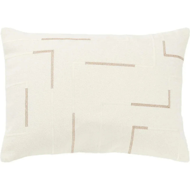 This knife edged pillow is made from a lovely cotton canvas with a pebbly light texture. The geometric pattern is woven into the base giving it a fresh crisp appeal. Satin stitch embroidery in silvery grey accents the woven in pattern. This pillow features a solid coordinating back with a hidden zipper closure. This pillow can fit into almost any decor. It adds a fresh appeal by both the streamlined and monochromatic color of the weaving as well as the accent stitched embroidery. Just that kiss of color brings a fresh spring like energy and vitality to any decor. This pillow has universal stylistic appeal. This striking pillow with accents of ivory and gold is the perfect piece to add a touch of luxury and refinement to any living space. Measuring 14" x 20" and made from 100% cotton, this geometric stripe pillow easily creates a glamorous and modern elevation to your interior. The solid coordinating back of the pillow has a hidden zipper closure for easy removal and cleaning.The knife-edged design showcases beautiful embroidery in gold, camel, and ivory hues in a sophisticated presentation, making it an excellent choice for adding texture and artistic inspiration to any room in your home or office. It's simply chic.