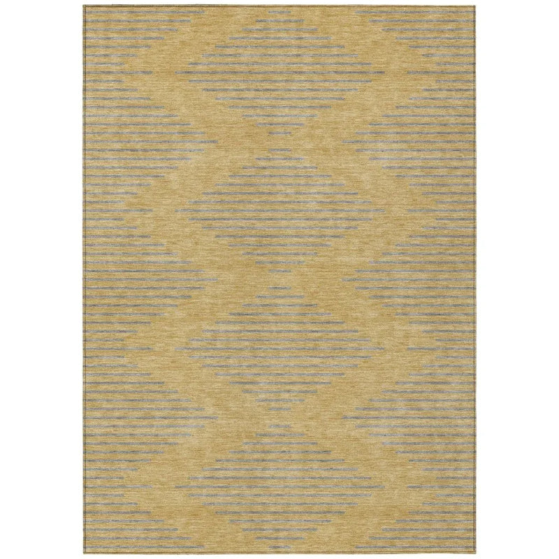 Introducing a rug that marries style with function, the Norelia Gold Washable Rug With UV Protection is the perfect addition to any space. This transitional area rug features a unique diamond motif, adding a touch of geometric elegance to your home. Crafted from polyester, this rug is designed to withstand the elements, making it suitable for both indoor and outdoor use. Its UV-stabilized fabric ensures protection against sun and weather, while the ultra-thin design allows it to fit seamlessly into any room without bulk.