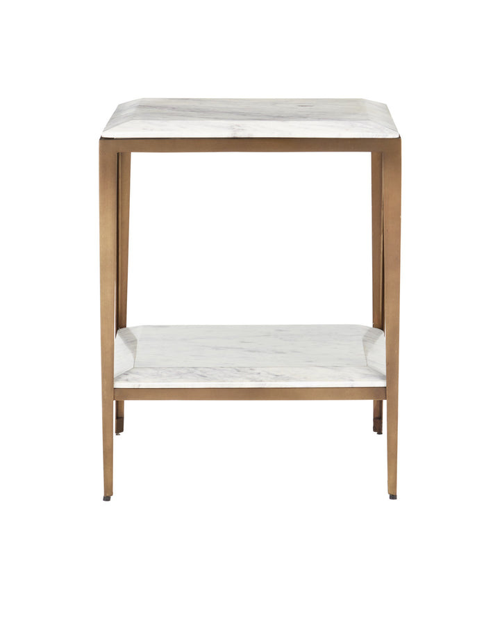 The Oblique Marble Side Table brings elegance and function to any space with its sleek design and quality materials. Featuring tapered legs and a slim metal frame in an antique brass finish, this table provides a modern touch. Its white lilac marble top and lower shelf have delicate veining, adding a unique charm to each piece. The marble surfaces sit slightly above the frame, creating a floating effect that adds visual depth and interest. This design choice not only enhances its aesthetic appeal but also underscores the table's refined craftsmanship.