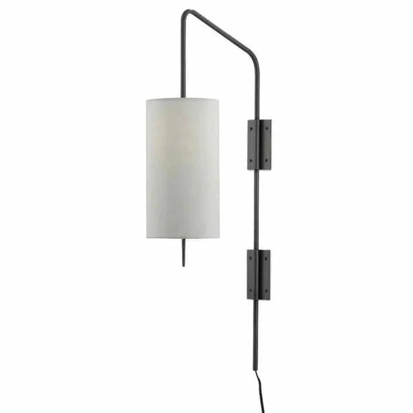 Our Tasmin Wall Sconce has an articulated armature made of metal in an oil-rubbed bronze finish. The angle of the arm that holds the bulb, the shape of the finial, and the way the off-white shantung shade cleanly joins the two makes this black sconce a cohesive design with a rough luxe vibe.