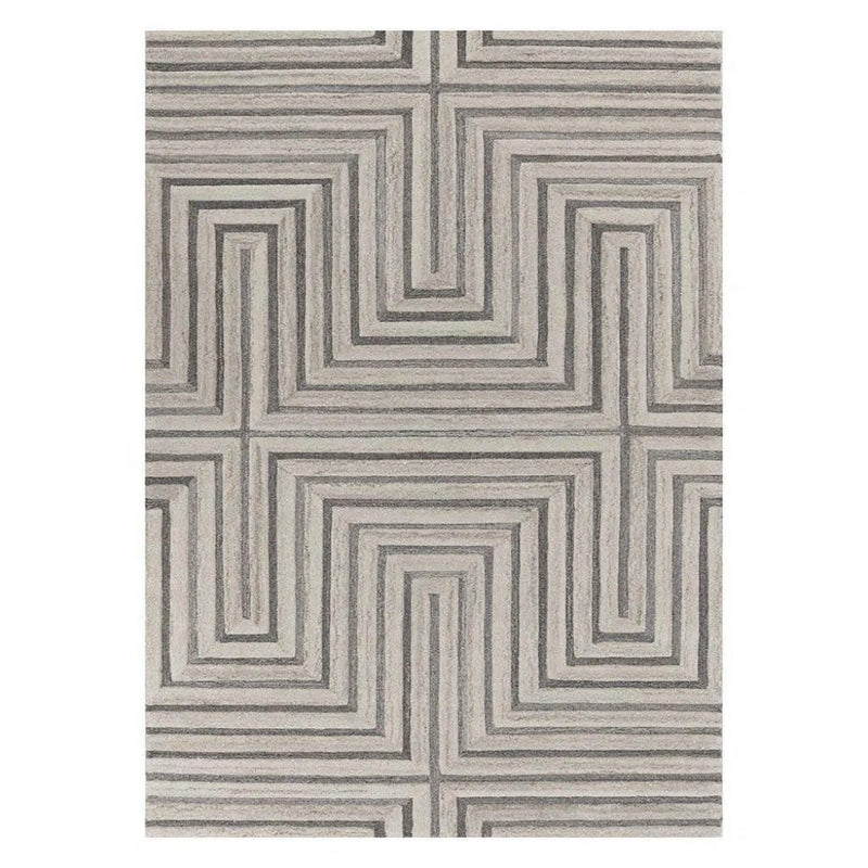 The Oslow Hand-Tufted Rug features bold, maze-like patterns crafted by skilled artisans using wool in complementary beige and grey hues. This striking rug is available in four sizes: 6' x 9', 8' x 10', 9' x 12', and 10' x 14'. Each piece is unique due to the artisan weaving process, with expected variations in color, design, and size. Wool rugs may shed initially, but this will decrease with regular vacuuming.