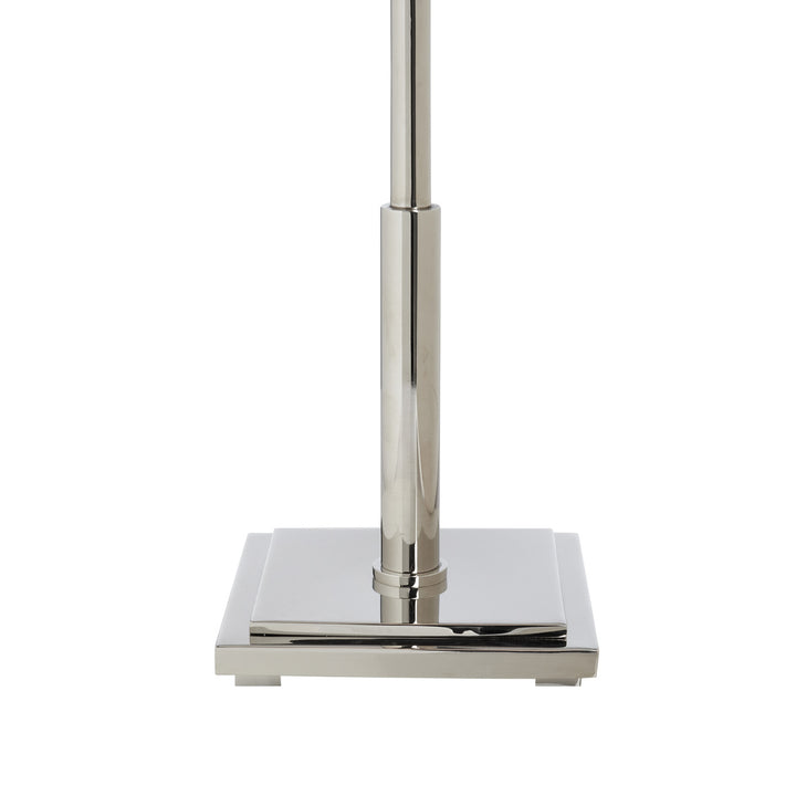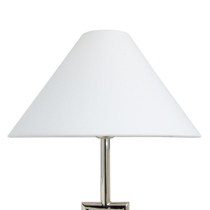 The Overhill Table Lamp stands out with its sleek metal design and polished nickel-aged brass finished, adding a touch of architectural elegance to any room. Its modern silhouette features a bold square accent, making it a striking piece for both contemporary and classic spaces. The lamp's silver metallic base pairs beautifully with a white conical shade, casting a soft, inviting glow. Designed by Jamie Merida, this lamp not only provides light but also serves as a stylish statement piece. Perfect for living rooms, bedrooms, or offices, it seamlessly combines functionality with timeless elegance, enhancing the overall aesthetic of any setting.