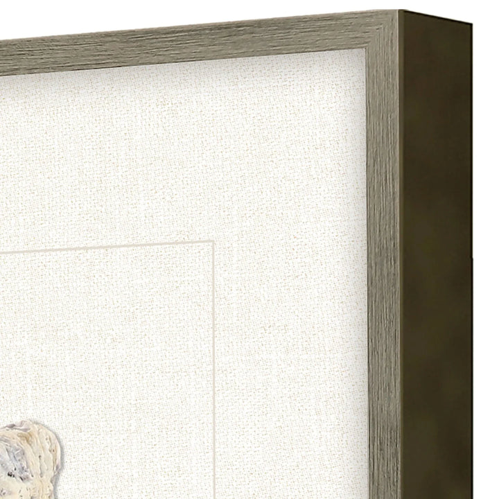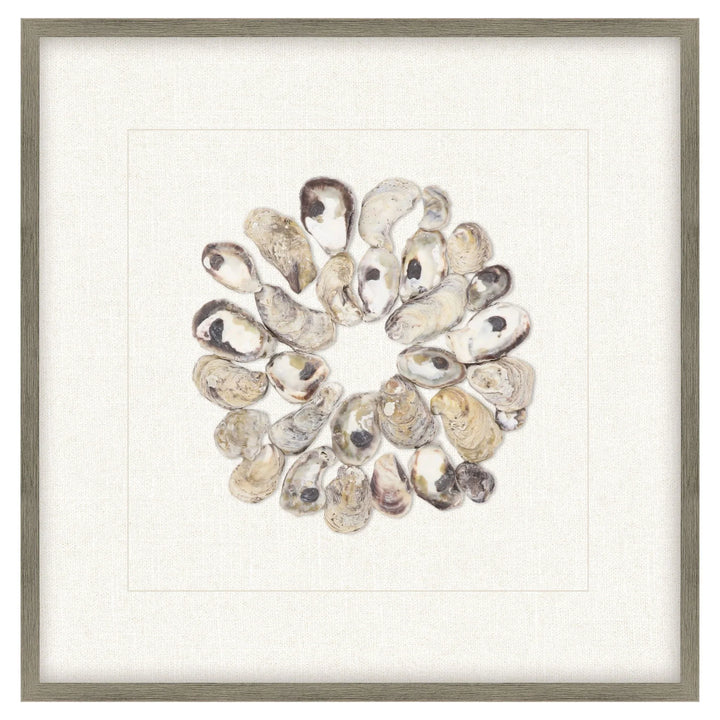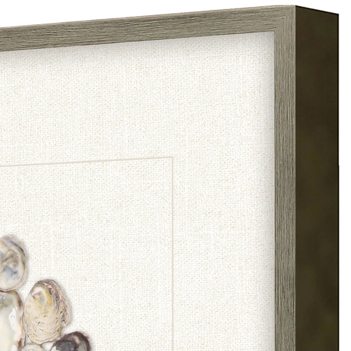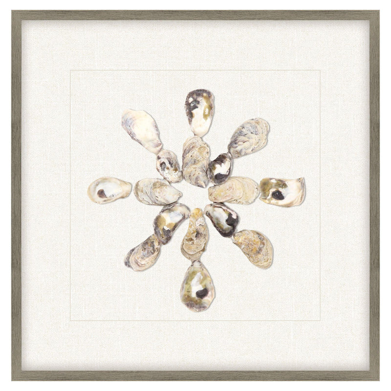 Enhance your home with this beautiful coastal wall art. Crafted with natural oyster shells, each piece is mounted by hand onto a high-quality matboard. The shells are arranged in a stunning radial pattern, showcasing their unique textures and colors. Framed in a dark taupe block profile wood, this piece brings a touch of nature into any room with its neutral palette of beige, cream, and subtle hints of brown and gray. The textured white background adds depth, making it a perfect addition to any coastal-themed decor.