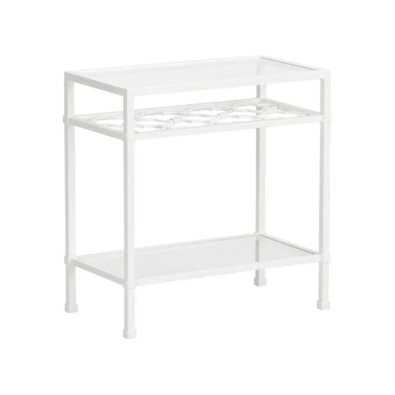 Enhance your living area with this side table that combines style and functionality. The Pacific Coast Side Table is crafted from durable metal and features a sleek white finish, making it a perfect addition to any room. With its minimalist design and elegant appearance, this table seamlessly fits into various decor styles. The table stands out with its unique quatrefoil design, beautifully displayed under the top glass shelf. This design not only adds a touch of sophistication but also allows for a clear view of the shelf's contents. This versatile side table offers two shelves, providing ample space to display cherished photographs, books, or accent pieces. Its open design ensures easy access to your items while maintaining a tidy appearance.