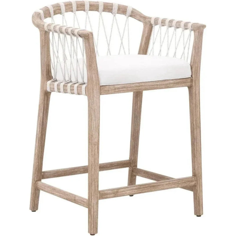 Transform your kitchen or bar area with the Pacific Counter Stool by Essentials For Living. This stool harmoniously blends beachy, classic, and contemporary elements for a unique seating solution. The frame, expertly crafted from solid mahogany wood, features a refined natural gray finish, adding a touch of understated elegance to any space. The seat is designed with a distinctive hand-wrapped white speckle flat rope on the back and high-performance LiveSmart Peyton-Pearl fabric on the seat cushion, ensuring durability and easy cleaning. The fixed seat cushion with piping detail enhances the tailored appearance of the stool. Additionally, the L-shaped metal footrest provides support while seamlessly blending with its wood counterparts. It measures 23.5" wide, 21.25" deep, and 39" high, with a seat height of 26.5".
