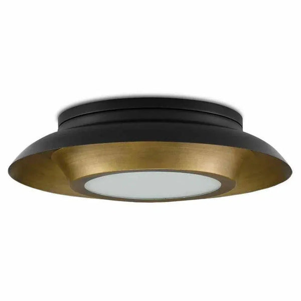 The Metaphor Flush Mount is made of brass in a mix of painted antique brass and painted black finishes. This intermingling of tones brings the gold and black flush mount a mid-century modern vibe. A frosted glass diffuser covers the light source.