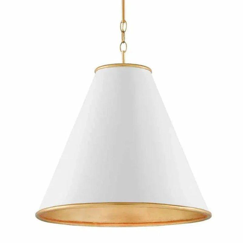 Our Pierrepont White Large Pendant is made of wrought iron with a gesso white finish on its exterior and a contemporary gold leaf finish on the interiors of the shades. The rings connecting them gleam in a painted gold finish. There are a number of other sizes and finishes in the Pierrepont family of fixtures. Adjustable from 27" to 104" with use of included chain/rod kit/cable. If your space calls for a longer drop, additional chain/rods/cable is available for purchase.