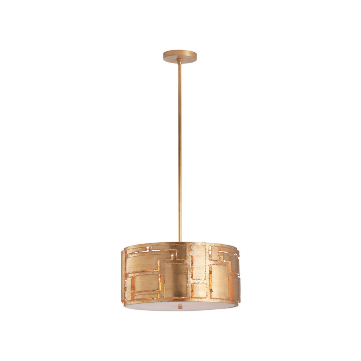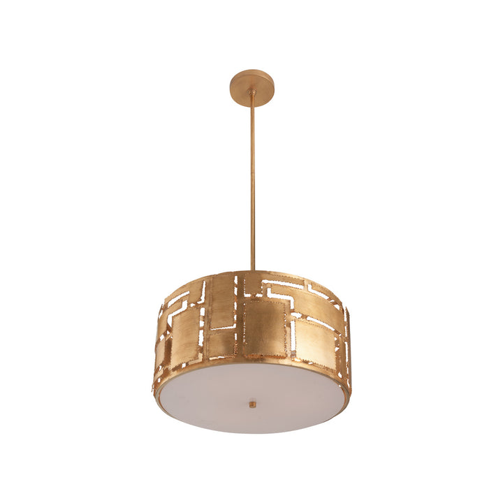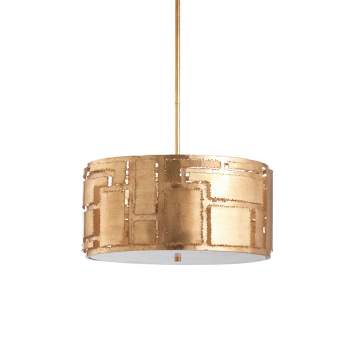 The Pane Pendant Gold Metal Light Geometric Elegance offers a modern touch to any room. With its clean rectangular shapes and geometric design, this gold metal pendant adds a stylish glow to your space. Its warm metallic finish complements various decors, making it a versatile choice for any home. It comes with two 12-inch rods and one 6-inch rod, allowing for adjustable hanging lengths. The pendant features a cylindrical shape with a geometric cut-out pattern and a central rod for a sleek, ceiling-mounted look. Illuminate your home with its subtle yet eye-catching design, perfect for any modern setting.