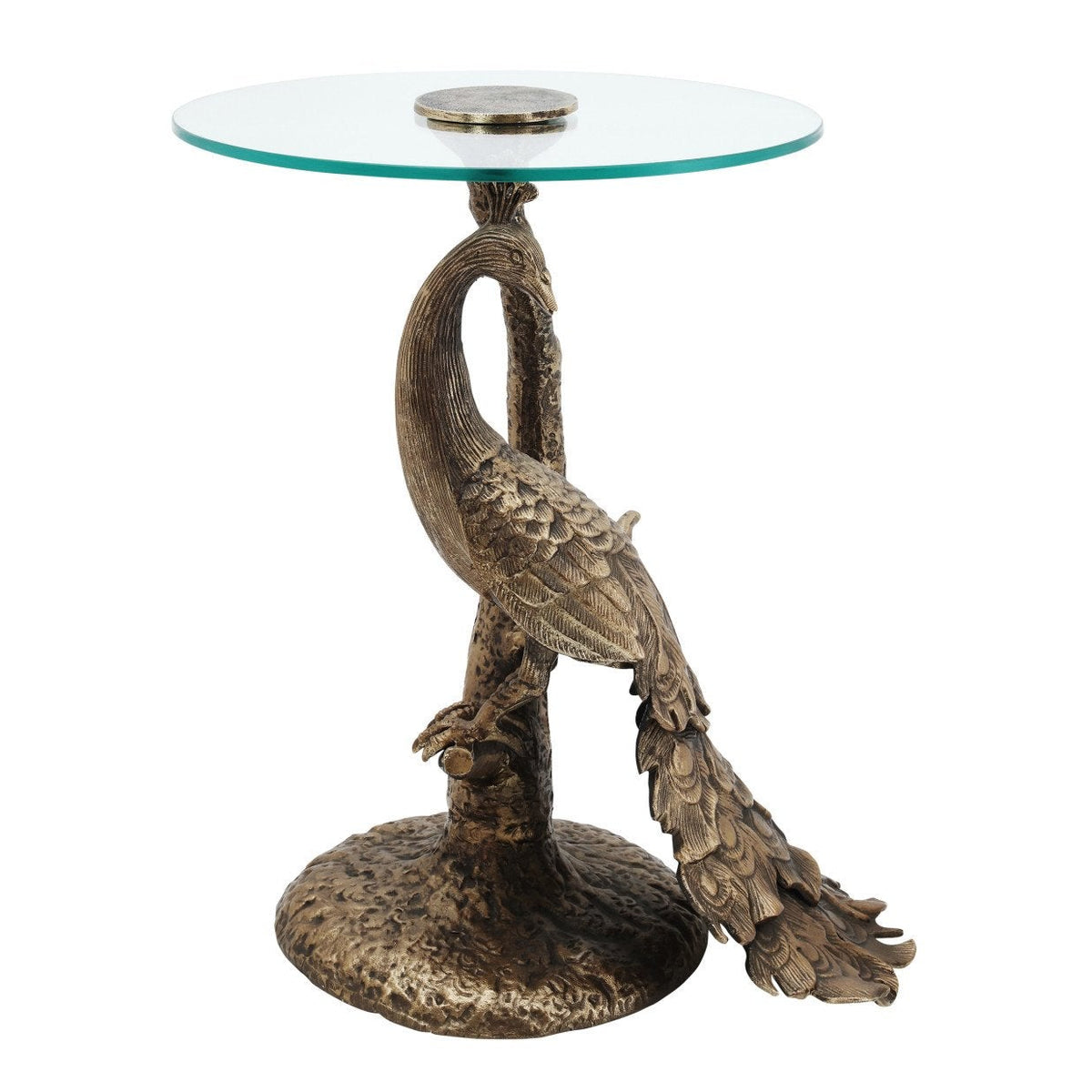 The Paonne Accent Table is made of cast aluminum in an antique gold finish and depicts a sculptural peacock perched on a tree limb. Its expressive tail fans outward, extending past the diameter of the round clear glass top for dramatic effect. The retro-inspired design is eye-catching and detailed, as elements such as the puck fastening the glass top to the stem being larger in diameter than the top of the sculpture is highly considered. Due to the artisanal finish, the surface of each table could differ slightly.