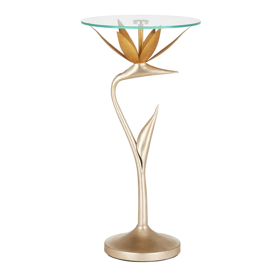 With a body made of steel, the Paradiso Gold & Silver Accent Table has a lyrical shape inspired by the Strelitzia reginae, more commonly known as the Bird of Paradise plant. The limb that arcs up, in a contemporary silver leaf finish, holds a blossom in a contemporary gold leaf finish. The two work in concert to balance the glass top. This silver and gold occasional table is an example of how nature-inspired design elements are driving the biophilic movement.