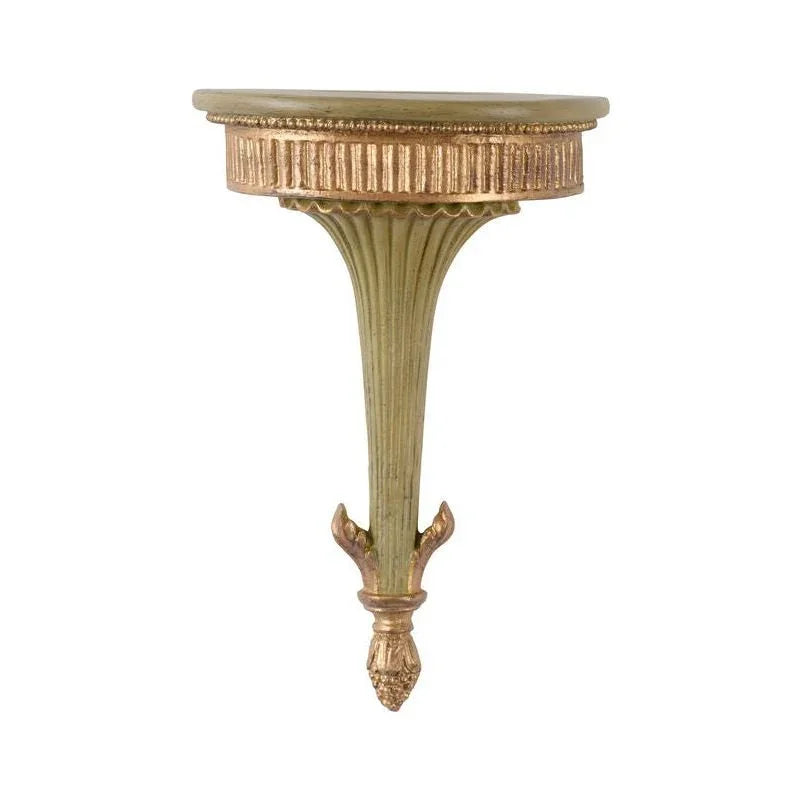 The Park Street Bracket Green Classic Wall-Mounted Shelf combines elegance with functionality. This shelf features a semi-circular top, providing a stylish platform for displaying your favorite items. Its Italy green and antique gold finish adds a touch of sophistication, while the gold accents enhance its classic appeal. The shelf is part of the Chelsea House Misc collection, ensuring it brings a timeless look to any room. Designed with a fluted, tapered base and ornate bottom details, this wall-mounted shelf adds a decorative element to your walls. Its compact size makes it suitable for various spaces, from living rooms to bedrooms. Whether used to showcase decorative pieces or as a functional space for essentials, this shelf offers versatility and style.