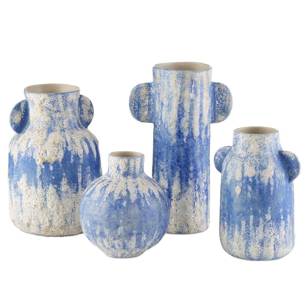 The Paros Blue Vase Set has a Mediterranean feel, thanks to the reactive glaze on the blue ceramic vases. The texture achieved by the artisans who created the four pieces resulted from their desire to mimic how a surface would feel were it covered in dried salt. The graininess is so pronounced, its depth is evident to the hand. These rustic vases will infuse a space with a lovely vintage feel.