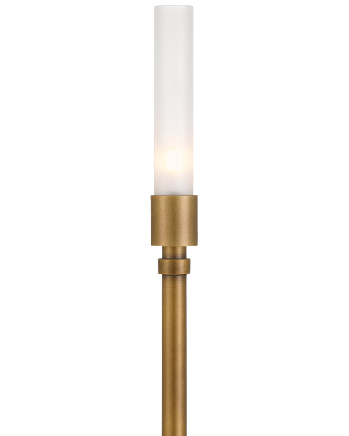 The Paseo Brass Cordless Table Lamp offers a stylish way to light up any room. Its elegant candelabra shape is paired with a slender, frosted white glass diffuser to spread a soft, warm glow. Made from durable metal and glass, this lamp combines modern design with classic charm. The gold color and brass finish add a touch of luxury, making it an eye-catching centerpiece for any table. The sleek, round base ensures stability, making it both functional and aesthetically pleasing.