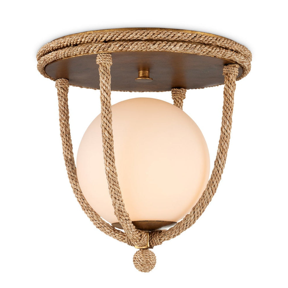 The Passageway Flush Mount is a cleverly designed rope-wrapped ceiling light. The warmth of the rope combined with the dorado gold finish contrasts the frosted glass globe to bring this design heft. One of the arms that hold the globe in place is removable to make changing the bulbs on this brown ceiling light easy.