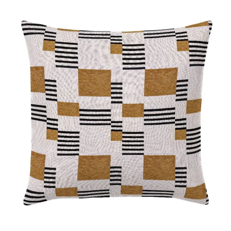 The Pavati Caramel Outdoor Pillow is a perfect blend of style and functionality, designed to elevate any outdoor space. Featuring a modern design with a beige background, mustard 20" Squares, and black stripes, this pillow adds a touch of sophistication to your patio or garden. Handmade in the USA, each piece reflects quality craftsmanship with surged seams for added durability, ensuring it stands up to the elements while enhancing your outdoor decor.