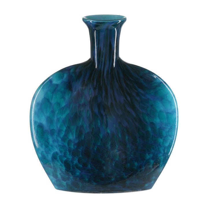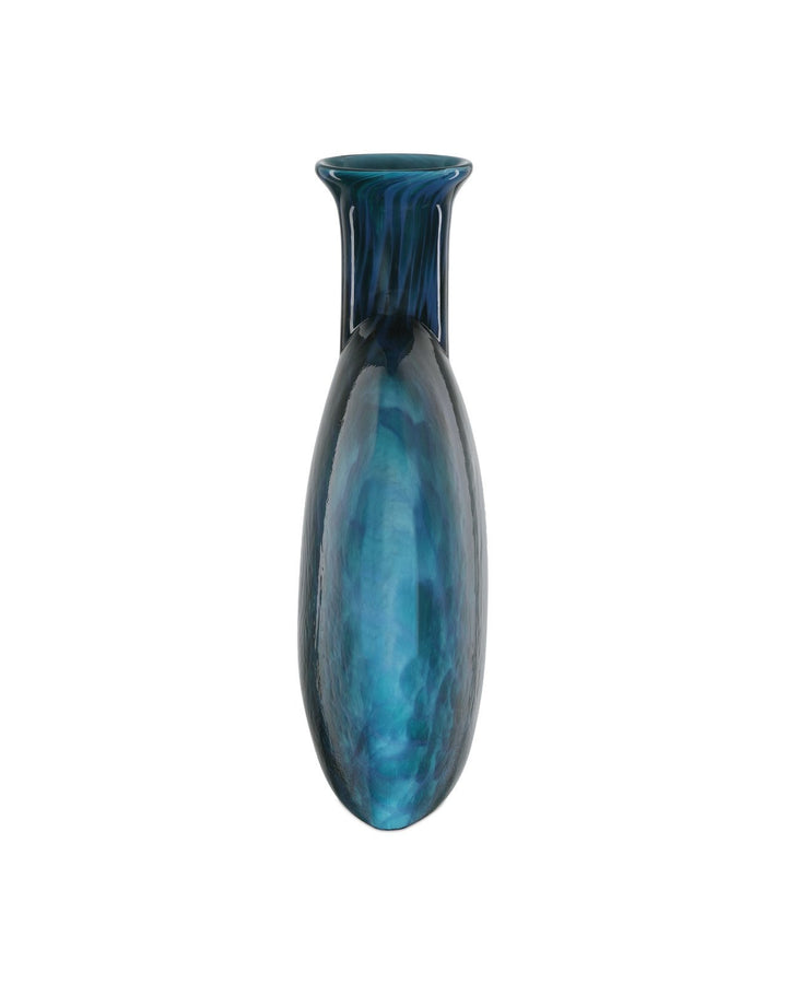 The Pavonini Vase brings a touch of elegance and artistry to any room with its unique design. Mold-made from high-quality glass, this vase stands out with its brilliant shade of blue reminiscent of an oversized perfume bottle. The captivating surface features intricate marbling, blending deep blue and bright teal to create a rich interplay of color and texture. This stunning piece serves as more than just a vase; it's an eye-catching work of art that enhances the beauty of any space.