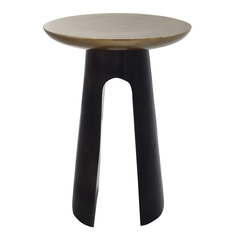 The Pince Accent Table is crafted from cast aluminum with an arched base in a black nickel finish and a subtly convex top in antique brass. Both surfaces feature a hand-hammered texture that adds depth and character to the metal. With its modern Gramercy Park aesthetic and solid construction, this table has a sleek look and a sturdy presence. Because it is made of an artisanal material, its surface may vary slightly from table to table.