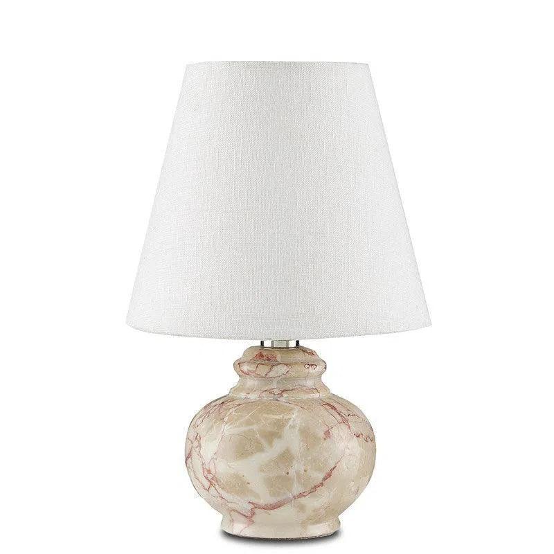 Introducing the Pink Piccolo Tan Mini Table Lamp, a sophisticated and exclusive piece that will elevate your decor. This exquisite lamp features stunning white and rose markings on pink marble, and was crafted with a vintage design in mind by our Currey Company product development team. Standing at 4.5 inches, it adds a touch of elegance to any bookcase or decorative arrangement.