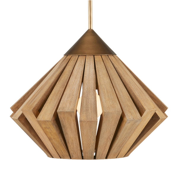 The thick wood slats that make up the shade of the Plunge Pendant brings the brown pendant a mid-century modern vibe with a hint of brutalist style. Fastened to a downturned metal cup in a brass finish, the slanting wood is finished in toffee, the combination creating great warmth. The varying placement of the angled wood pieces is a design detail of note, as is the fact that this fixture can be hung close to the ceiling.