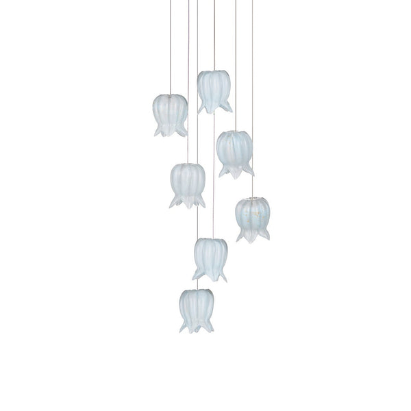 The Polpo Blue, Green, Misto and White 7-Light Round Multi-Drop Pendant has bell-shaped shades that echo the form of inverted lily-of-the-valley flowers. Made of pale blue art glass with pronounced stippling, each shade has subtle variations that make it unique. The textured surfaces give the glass a Venetian-inspired character, adding depth and richness to the design.