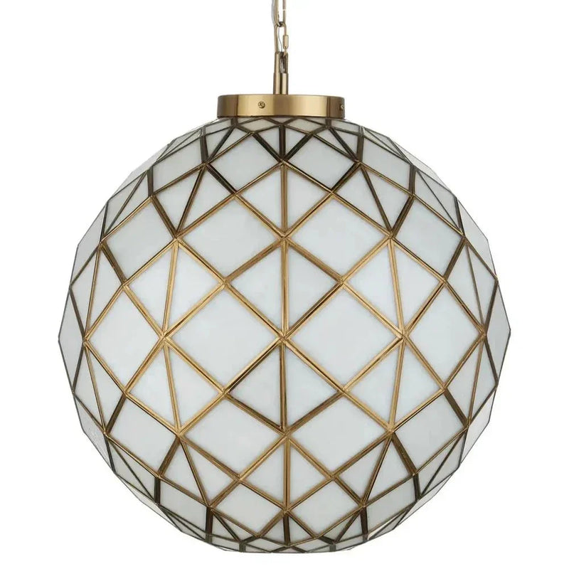 The medium size has a 20.5-inch diameter and is crafted from high-quality glass and brass for durability and a polished finish. Both sizes feature a geometric design with triangular glass panes, and the antique brass finish complements a variety of decor styles. Perfect for adding elegance to a specific room or updating your lighting, the Polyhedron Glass Pendant Light is a versatile and stylish choice.