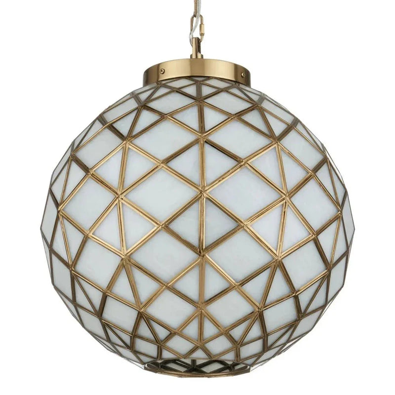 The Polyhedron Glass Pendant Light expertly combines modern style and elegance to create a striking focal point in any space. Its unique triangular white glass panels are meticulously assembled with antique brass details, resulting in a mesmerizing geometric design. The milky white shades add dimension and depth, producing a captivating glow when lit. The adjustable drop length allows for adaptable use on different ceiling heights, while the smaller 16-inch diameter size offers ample illumination without taking up too much space.