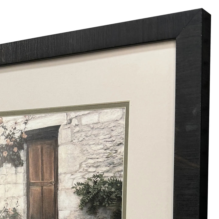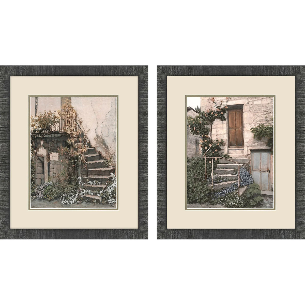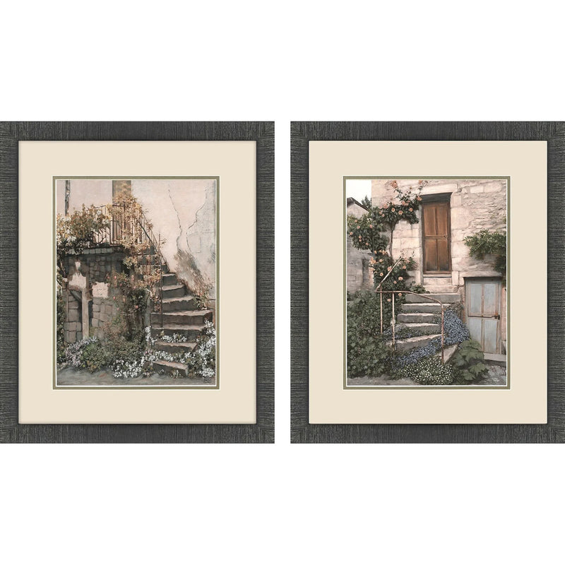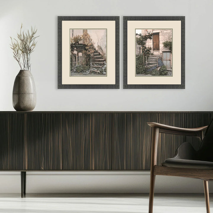 Enhance your living space with the elegance of European charm through the Porte S/2 Framed Wall Art Set With Glass Front. This exquisite art set captures the rustic beauty of stone staircases adorned with ivy and flowers, bringing a touch of vintage architectural allure to any room. The neutral tones of beige, gray, and green create a soothing palette, ensuring the set complements a variety of interior styles. Each piece is meticulously matted in putty and framed in a sleek, dark espresso wood finish, offering a refined and sophisticated appearance. The traditional style adds a timeless appeal, seamlessly integrating with both modern and classic decor.