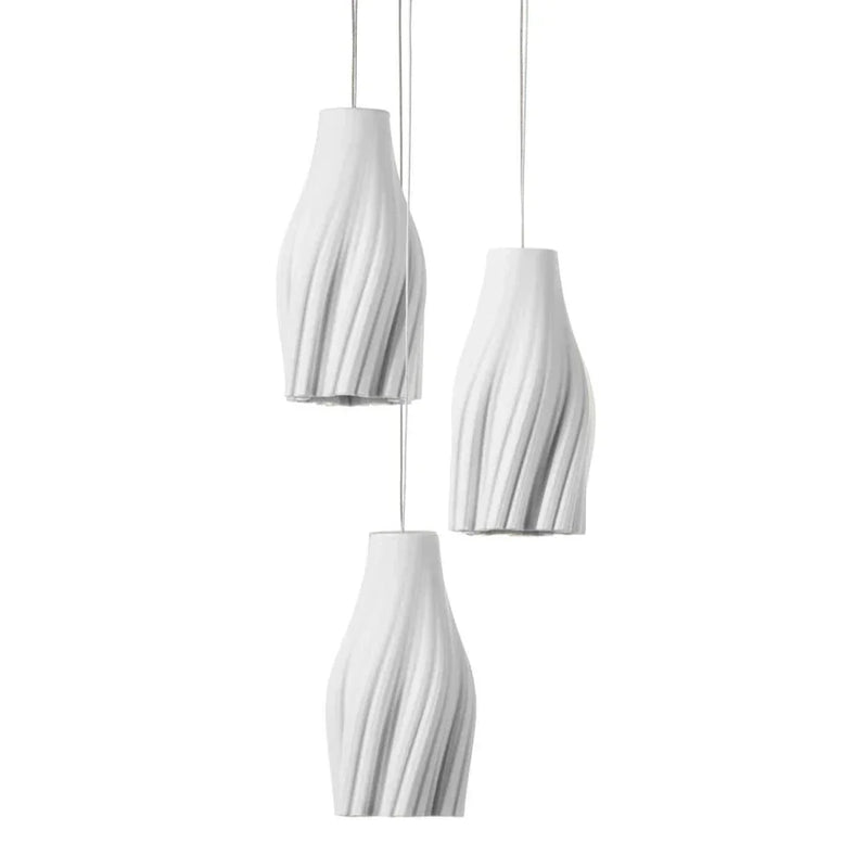 The Posh 3-Light Round Multi-Drop Pendant is a sophisticated lighting fixture that brings an artistic touch to any interior space. Its three individual shades are carefully crafted from white ceramic and elegantly shaped to resemble tassels, evoking a sense of fluidity and movement. This sculptural detail lends a graceful and organic aesthetic to the piece, showcasing the artisan craftsmanship behind its design. The ceramic material adds texture and depth, making the pendant a refined focal point whether it's installed in a living room, dining area, or over a kitchen island.