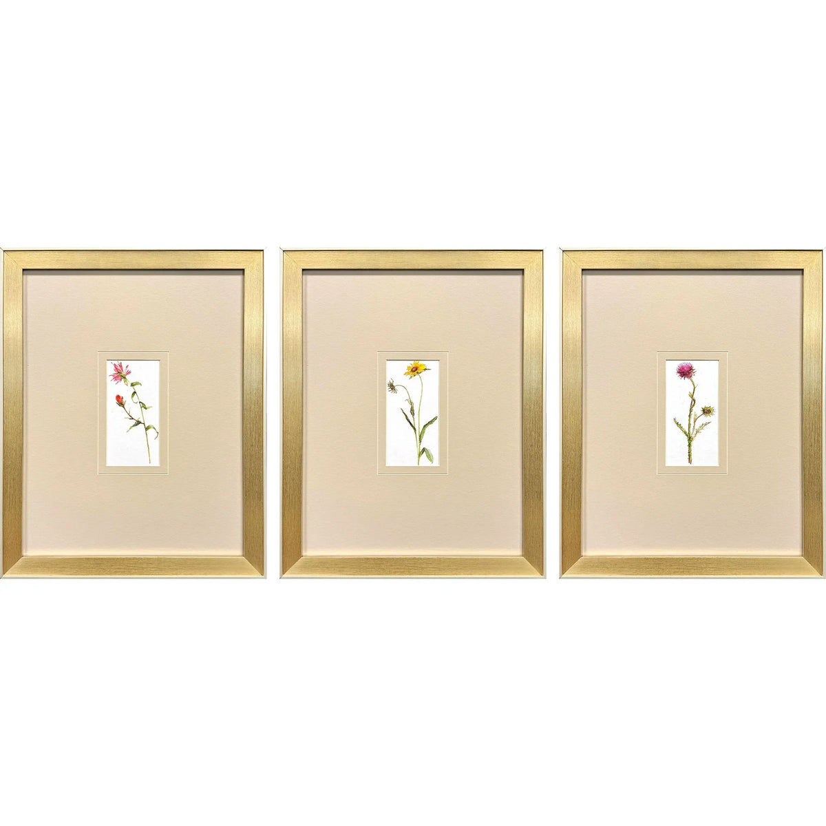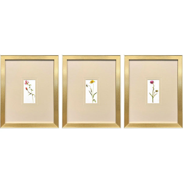 Enhance your living space with a touch of nature through this exquisite set of floral prints. These prints capture the delicate beauty of floral stems, artfully matted in a subtle corn starch hue. Framed in a modern gold finish, these prints are designed to add elegance to any room. The champagne side and lip of the frames add a sophisticated touch, making them a perfect fit for traditional décor styles. The vibrant colors of red, yellow, and purple flowers bring a burst of life and color, brightening your walls with their timeless charm.