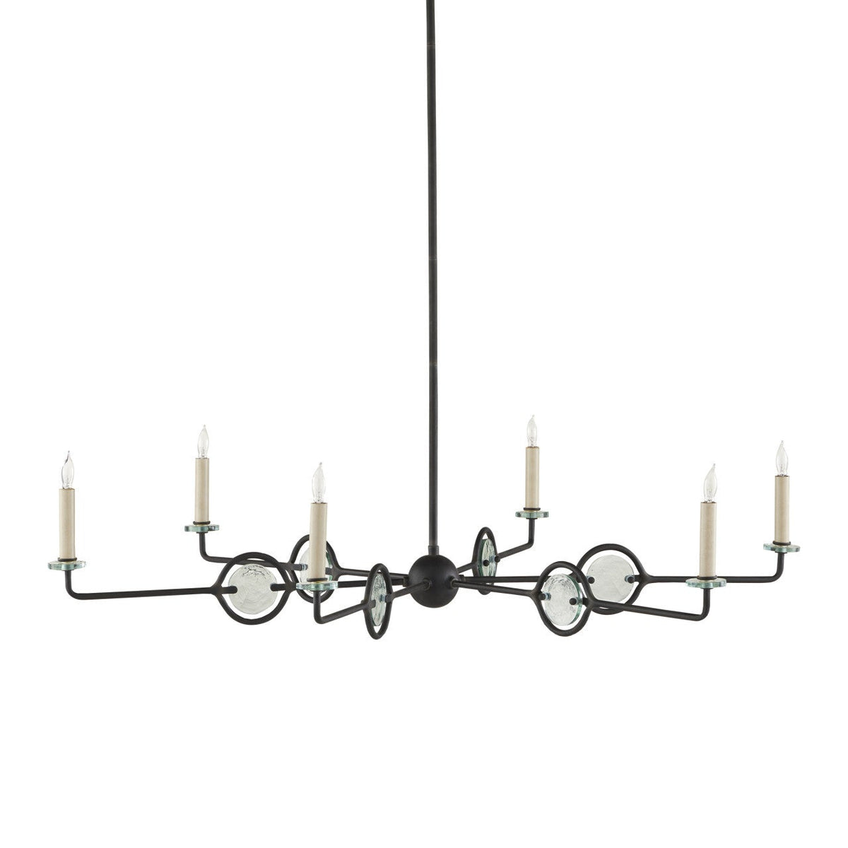 The Privateer Chandelier is one of our designs that mixes black with recycled glass in a sophisticated way. The long thin rod that culminates at a cog holding the arms, and the arms and circlets holding the glass pieces are in a blacksmith finish. The bobeches are also glass, and the candle sleeves are in a smokewood finish.