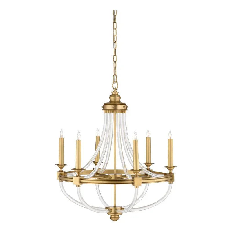 Transform your living space with a touch of elegance with this gold lighting fixture. The chandelier features a stunning antique brass finish that adds a timeless charm to any room. Its six candle-style lights provide ample illumination while creating a warm and inviting atmosphere. The circular design is complemented by clear acrylic curved rod details, offering a modern twist to a classic piece. Whether you're hosting a dinner party or enjoying a quiet evening at home, this chandelier enhances the ambiance with its sophisticated presence. Designed to captivate, the chandelier hangs gracefully from a 6-foot chain, making it suitable for various ceiling heights.