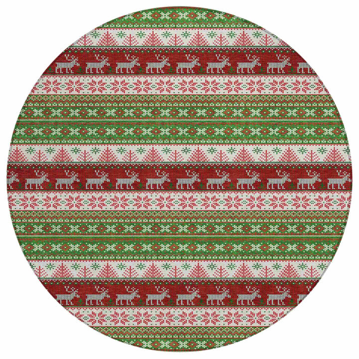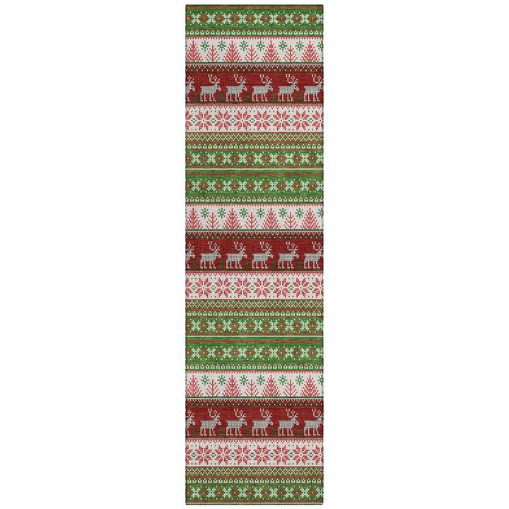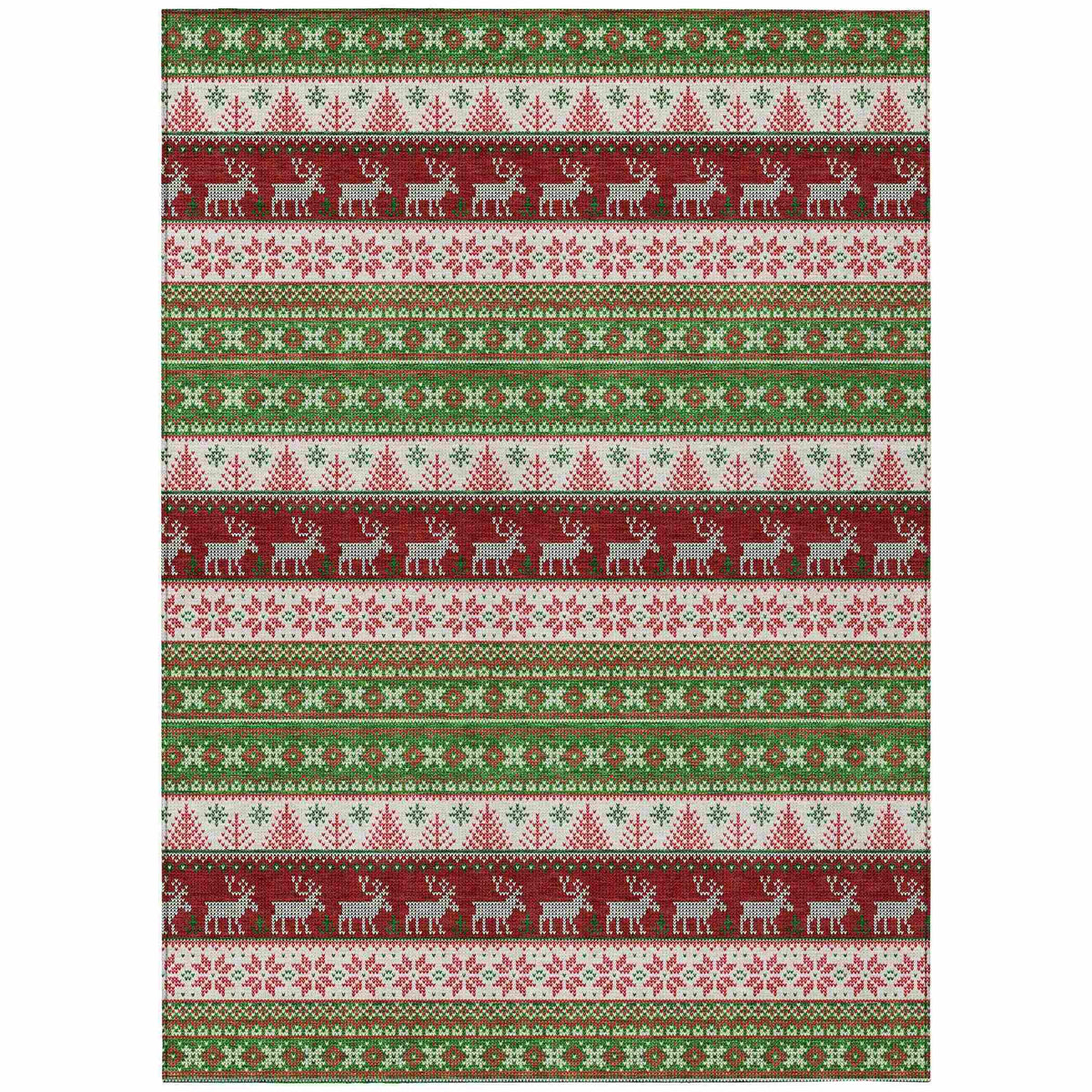 The Quaara Green Washable Rug brings a festive touch to your home with its charming Christmas sweater stripes featuring deer and snowflakes. This design adds a cozy and fun atmosphere to your holiday decor. Its transitional style effortlessly blends modern and classic elements, making it suitable for various spaces. Whether you're decorating indoors or outdoors, this rug is UV-stabilized to withstand exposure to sunlight, ensuring long-lasting color and durability.