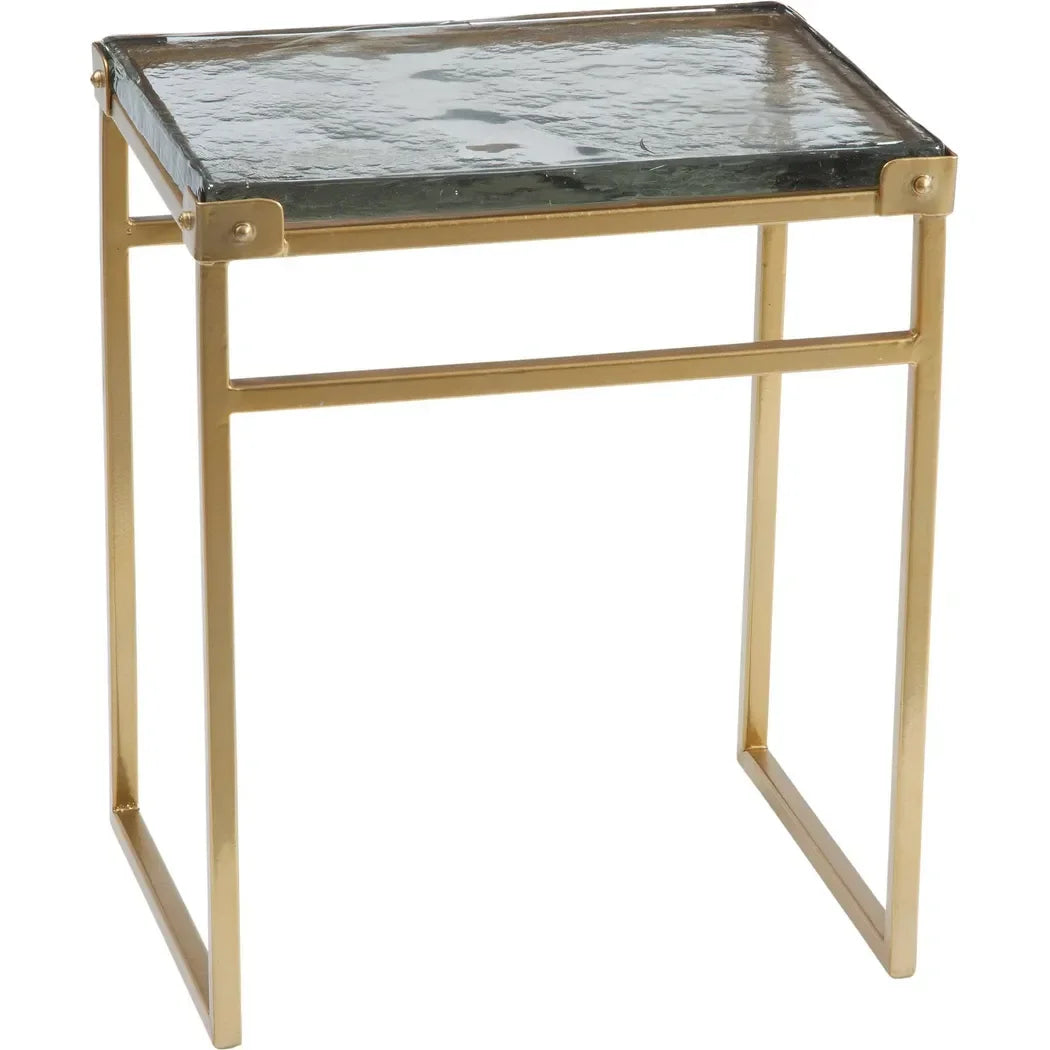Radley Accent Table is rectangular featuring a cast glass top surrounded by a gold finished rectangular metal base with rivet accents at each corner. Glass casting is the method in which glass items are made by directing molten glass into a mold where it hardens.