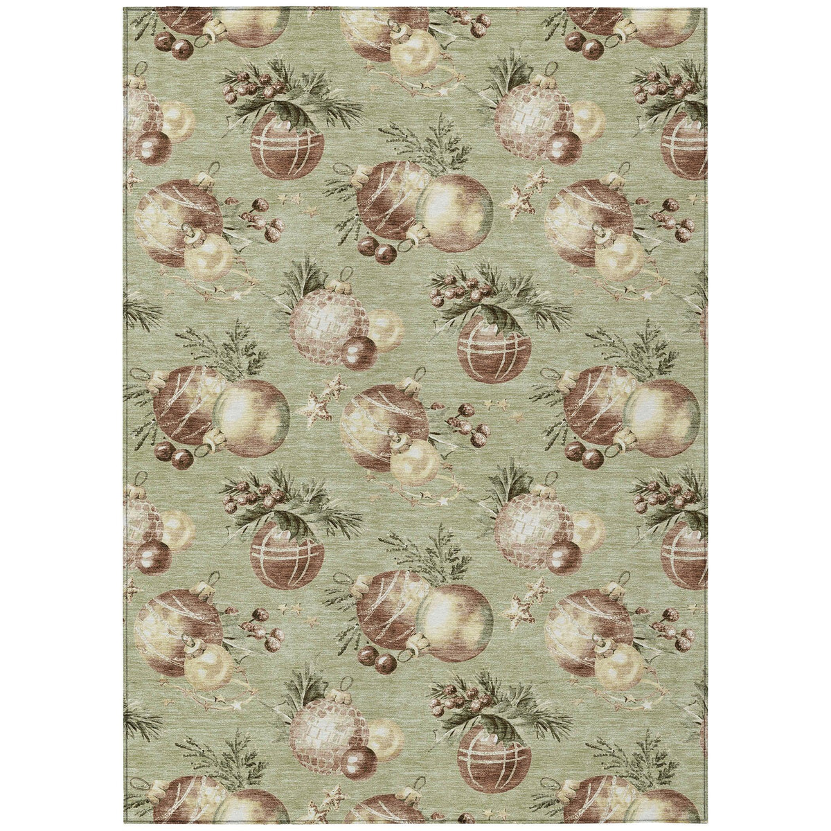 The Raearis Aloe Washable Indoor-Outdoor Rug is designed to bring a touch of festive cheer to any space. With its delightful pattern of gold ornaments, holly, and stars, this rug adds a cozy and inviting feel to your home. The gold tones lend a luxurious sparkle, making it perfect for holiday gatherings. Whether your style is modern or classic, this transitional design complements any decor. Its ultra-thin construction ensures easy placement in various areas, and its UV-stabilized material makes it suitable for both indoor and outdoor use. The aloe color adds a subtle touch of nature, enhancing the overall aesthetic.