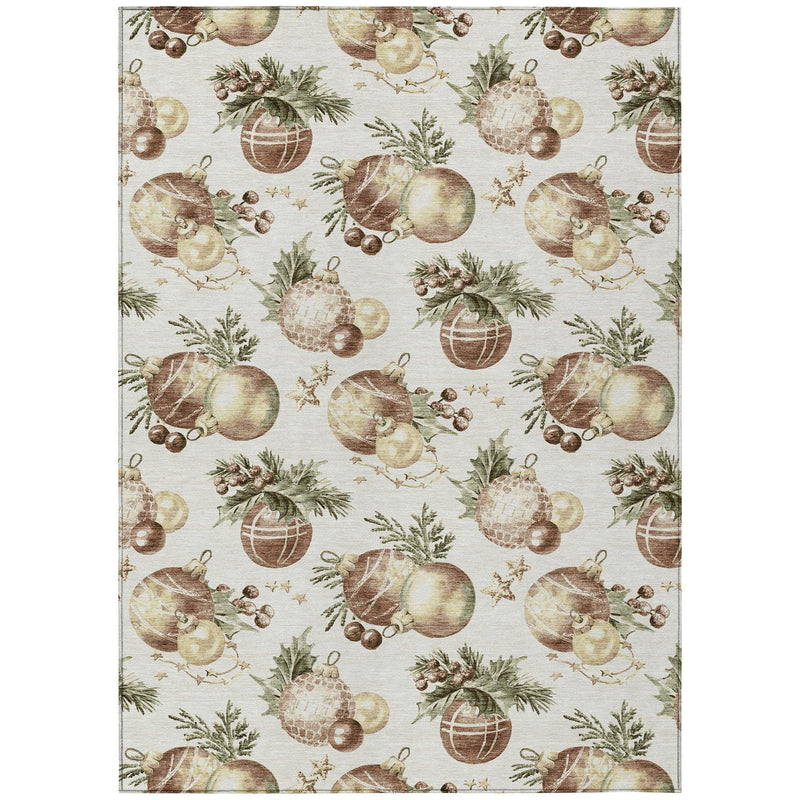 The Raearis Ivory Washable Indoor-Outdoor Rug is adorned with a beautiful blend of gold ornaments, holly, and stars, creating a warm holiday ambiance. The gold accents add a touch of luxury, while the holly and stars evoke a cozy, festive atmosphere, making it an ideal choice for Christmas décor. This rug's transitional style ensures it fits seamlessly into both modern and classic settings, making it a versatile addition to any home.