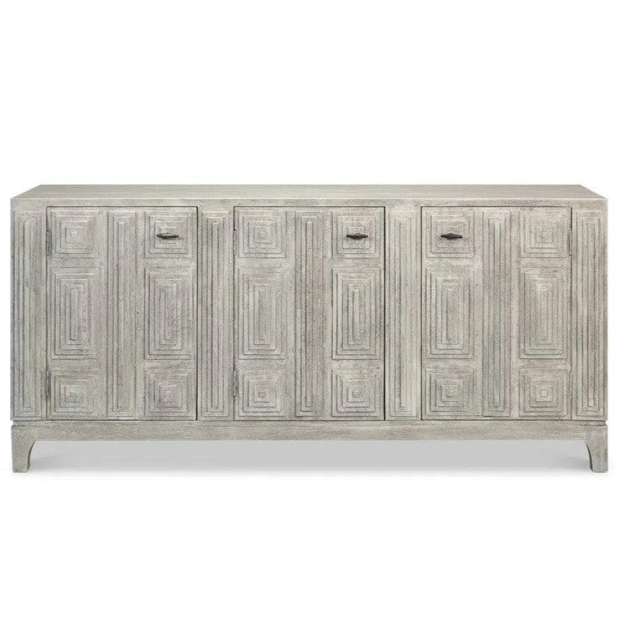 Elevate and optimize dining areas and kitchens in need of extra storage with this mango Wood sideboard. Adorned with dimensional panels and iron accents, this piece exudes elegance and functionality. Behind each of the three doors, you'll find three adjustable shelves, perfect for organizing plates, glassware, serveware, and linens. The stunning multistep charcoal finish highlights the distinctive Wood grain, adding natural beauty to any room. Easy to assemble, this versatile sideboard is a practical and stylish addition to any home.