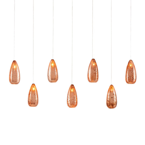The Rame Rectangular 7-Light Multi-Drop Pendant has teardrop-shaped shades made of mercury glass with silver on the inside and copper on the outside. The personality of the patterns on the glass is evident whether the lights are switched on or not but when illumination brightens the shades, the effect is dazzling. The canopy of this piece is luminous in a painted silver finish. This fixture is among Currey & Company's multi-drop pendant collection, which includes multiple configurations.