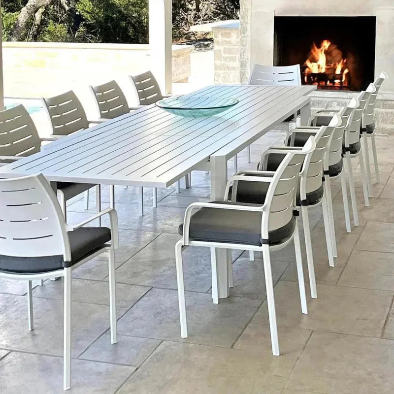 Extendable White Outdoor Dining Table Set for 12 with Sunbrella Cushions Features: