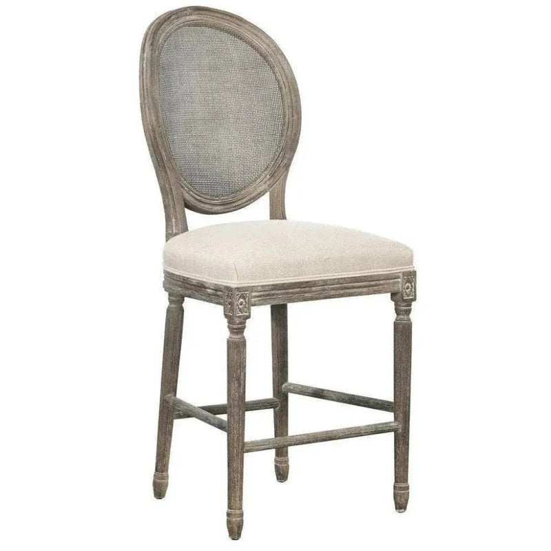 Revamp your space with the bold and daring Renton Counter Stool! The solid oak structure boasts intricate hand-carved details and a striking dry-brushed gray finish, while the woven rattan backs add an edge. Sit on the neutral linen cushion and embrace the unique blend of textures and traditional craftsmanship.