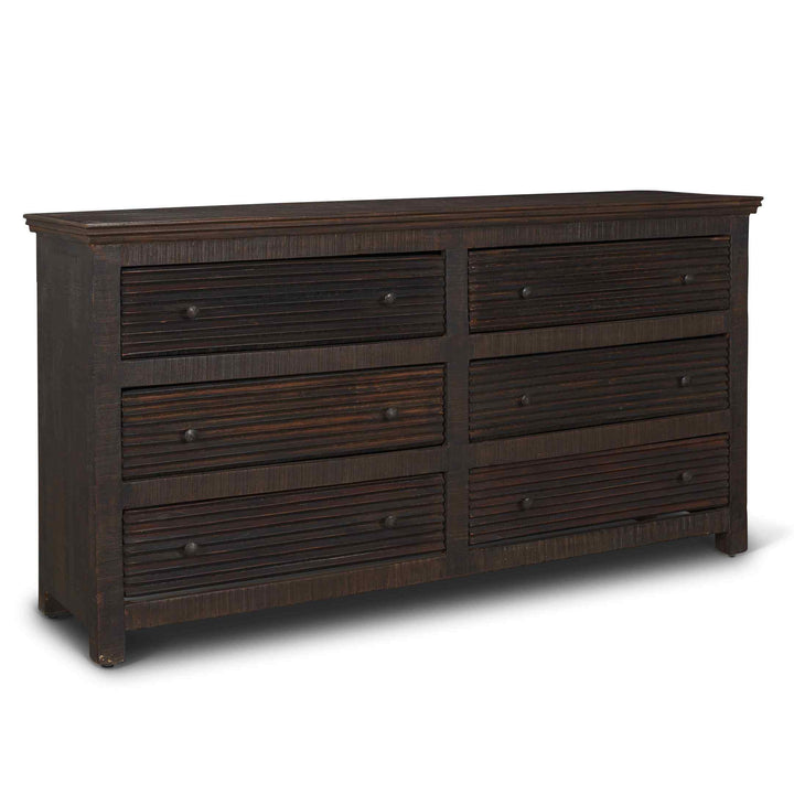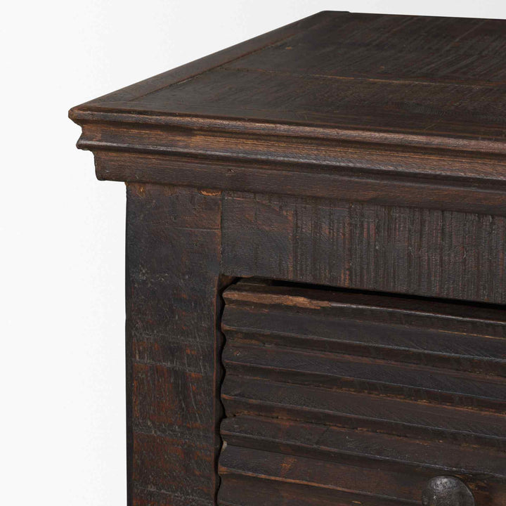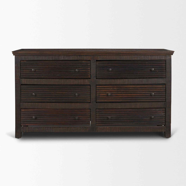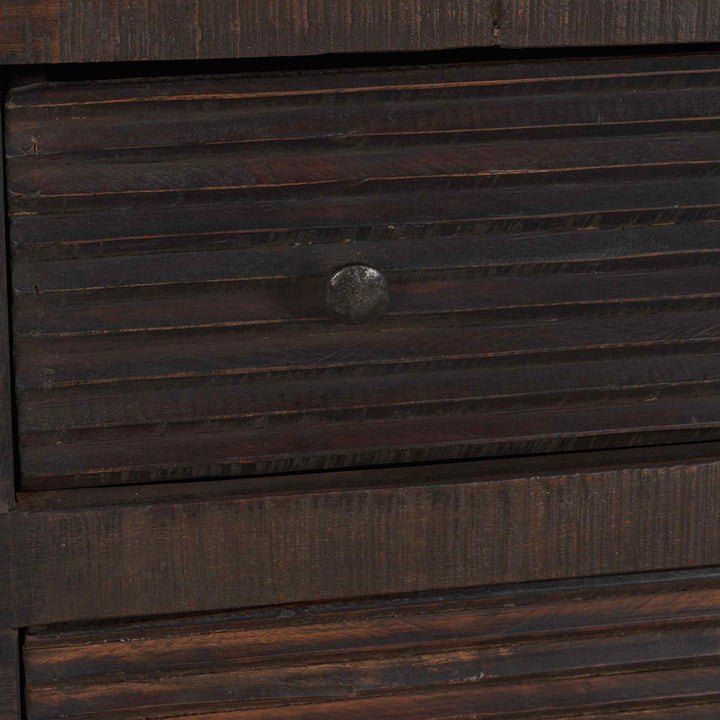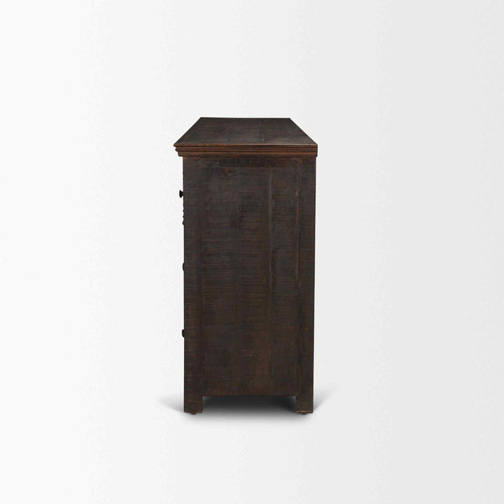 The Rhett Reclaimed Wood Cabinet brings a touch of rustic charm to any space. Made from reclaimed wood, it showcases a mid-dark brown finish with red undertones, highlighting its natural imperfections and rich character. The sharp-ridge carved fronts and vintage-style iron knobs add texture and a handcrafted appeal. This cabinet, with its six spacious drawers, offers ample storage while enhancing the aesthetic of farmhouse dining rooms or rustic-contemporary living areas. Its solid wood construction ensures durability, and the saw marks and carved details provide a unique, timeless look. This piece blends functionality with striking design, making it perfect for anyone looking to add character to their home.