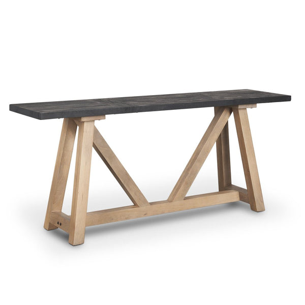 Your living room has a beautiful long sofa, but the back wall behind it feels stark and unfinished no matter what you try. The Mercana Rialto Two-Toned Color Wooden Console Table is a 70-inch Contemporary geometric console table built for showcasing decorative objects behind large sofas, available at LOOMLAN with free shipping to the continental US. This striking piece combines solid mango wood with a rich black stain on the tabletop with light brown angular legs that create compelling visual contrast. The 18-inch depth makes it perfect for narrow spaces, while the sandblasted texture on the top surface adds subtle character that catches light beautifully. Whether you're filling the space behind your sectional or creating a statement moment in your entryway, this console delivers the modern geometric appeal that makes rooms feel intentionally designed rather than accidentally furnished.