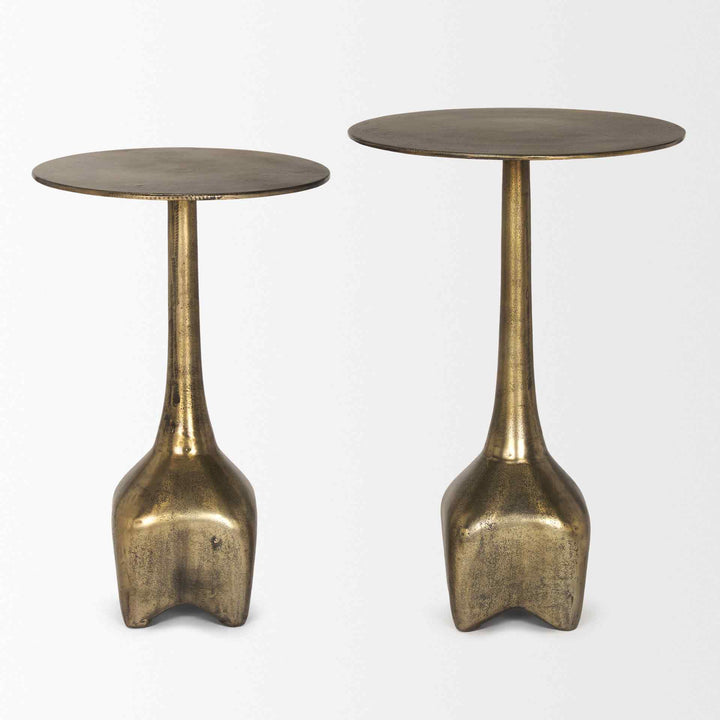 The Risha Accent Table is a masterpiece of design and elegance, crafted from high-quality cast aluminum. This table stands out with its textured electroplated antiqued brass finish, adding a touch of sophistication to any room. Its design features a sleek round tabletop, a slender neck, and a beautifully sculpted base. This combination not only provides a functional surface but also enhances the table's aesthetic appeal, making it a perfect fit for contemporary interiors.